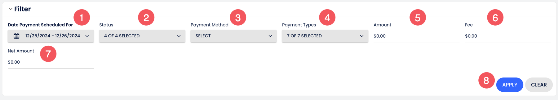 - Date Payment Scheduled For: Select the date range for which the payment has been processed, failed, or scheduled.