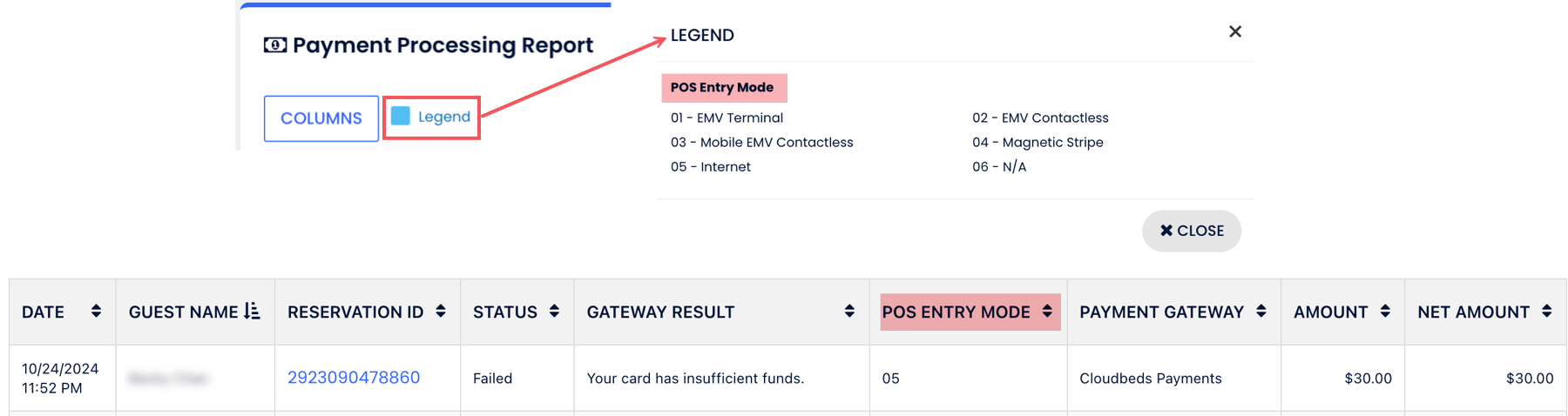 Terminal Payment, Chargeback, Chargeback Fee, Chargeback Reversal, Fee, and Net Amount are available for Cloudbeds Payments only. Learn more: