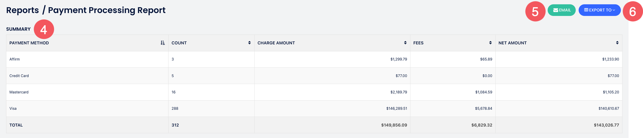 - Summary: This table shows summary of transactions per card type. Fees and Net Amount column are for Cloudbeds Payments only.