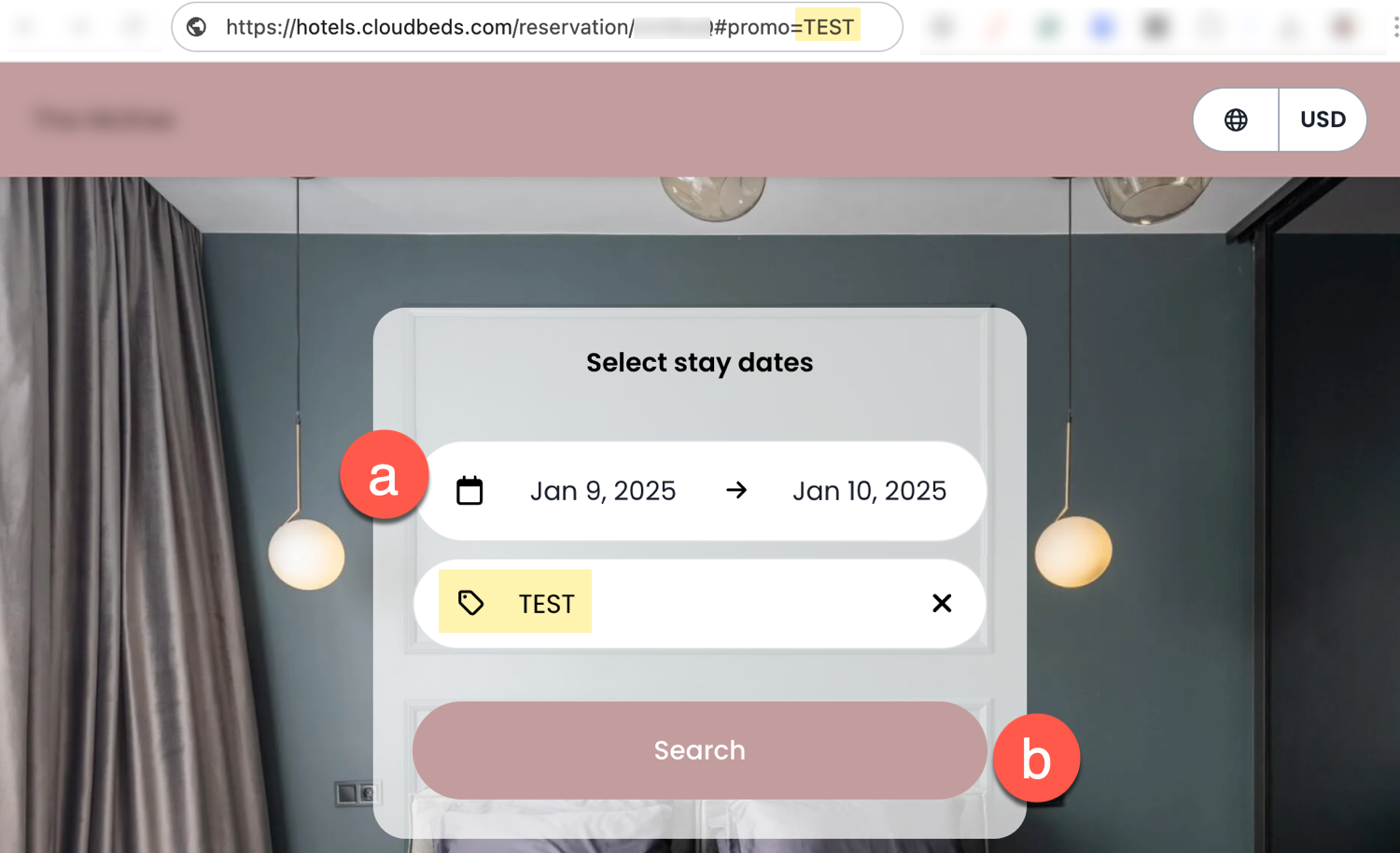 https://hotels.cloudbeds.com/reservation/YourUniqueCode/#promo=test test