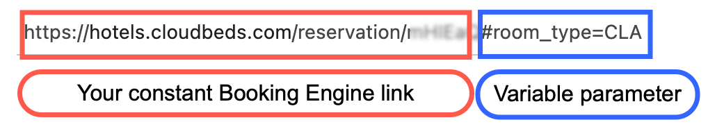 - The blurred code between the word "reservation/ " and the " #room_type=" is your unique Booking Engine code. This is part of your constant Booking Engine link (you don't need to add this information manually)