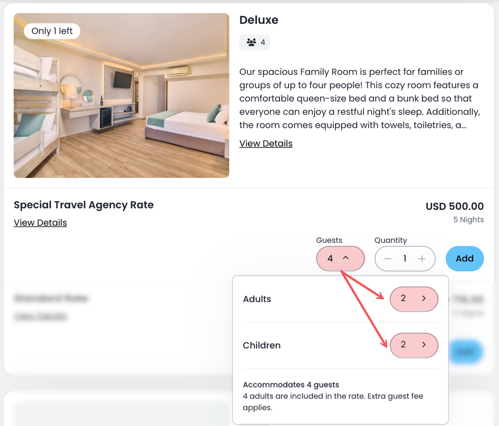 - Deluxe room: 2 adults and 2 children are selected because the Maximum Occupancy is 4 pax.