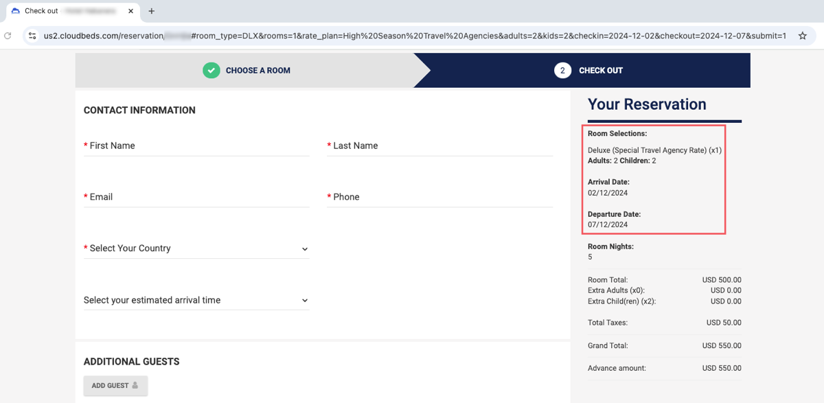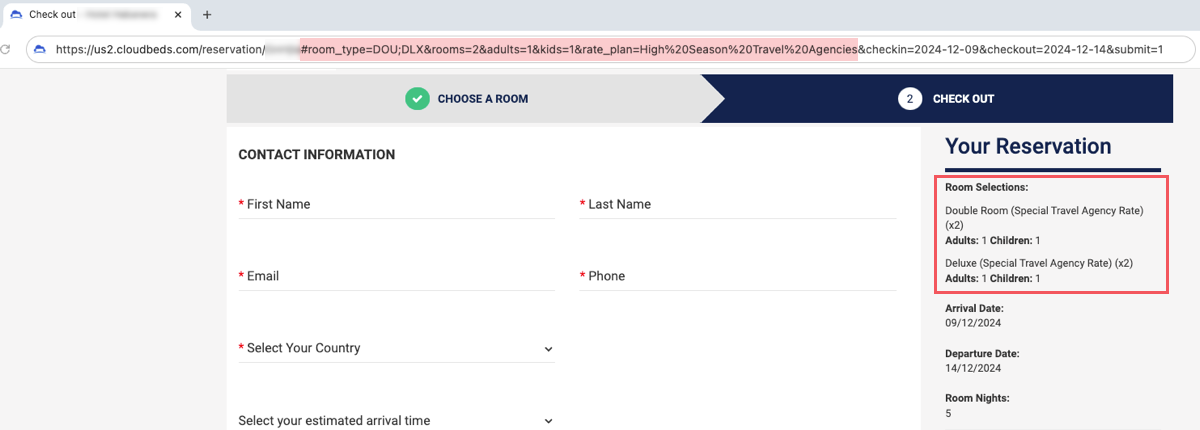 For example: #room_type=DOU;DLX&rooms=2&adults=1&kids=1&rate_plan=High%20Season%20Travel%20Agencies&checkin=2024-12-09&checkout=2024-12-14&submit=1