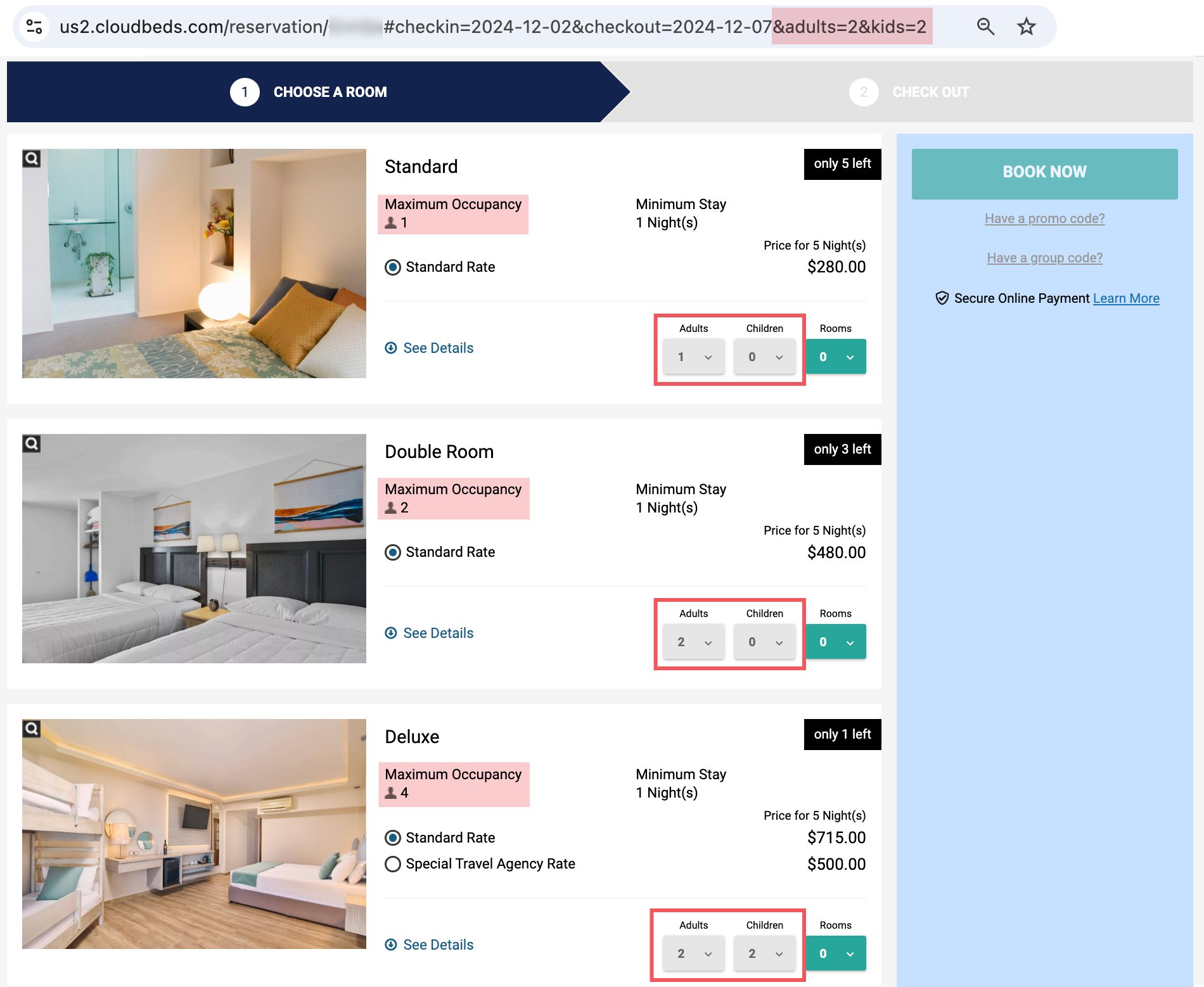 The images below exemplify what the Booking Engine (Old version) and Booking Engine Plus (Cloudbeds Booking Page V3) look like when we use the parameters #checkin=2024-12-02&checkout=2024-12-07&adults=2&kids=2. Although we specify that we want to book for 2 adults and 2 children, the booking engine shows the following: