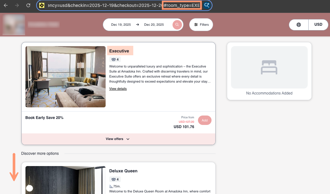 On Booking Engine Plus, this parameter highlights the selected room type (for example, the Executive room) at the top of the results, but other available room types will still appear below in the Discover more options section.
