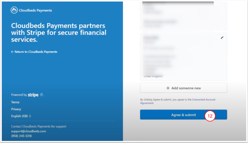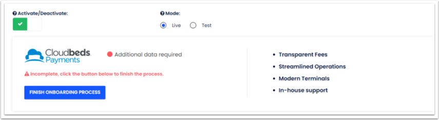 Once redirected to Cloudbeds, this is the last step to be completed. You will need to add a bank account under the company legal name where you will receive the payouts from Cloudbeds Payments. More information about payouts: Cloudbeds Payments - Payout Times & Reporting Overview