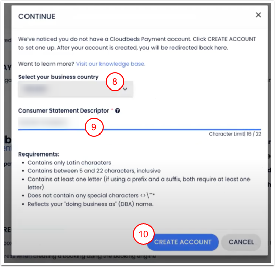 The Consumer Statement Descriptor will display on the statement of your guest, once they process a transaction with your business. By default, the Statement Descriptor is the DBA (Doing Business As) name you provided when applying for your merchant account. Cloudbeds recommends using your property name, which will be recognized by your guests and help prevent disputes.