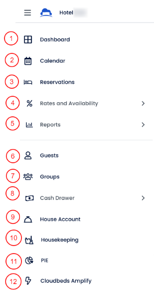 Find the direct access to the main sections of your Cloudbeds platform, products and features (such as PIE or Cloudbeds Amplify) |