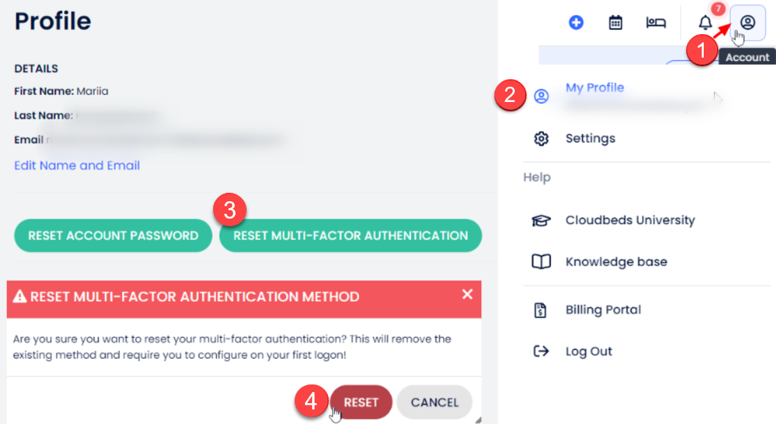 Cloudbeds uses multifactor authentication solution (MFA) to guarantee an extra layer of security to your account. Check below how to reset your multi-factor authentication method, if needed.