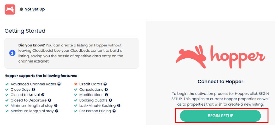 - You need to set up a Hopper account through Cloudbeds PMS. Click Begin Setup and follow the subsequent instructions. Once the setup is complete, proceed with the following steps;