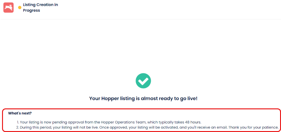 - Almost ready - Your listing is now pending approval from the Hopper Operations Team, which typically takes 48 hours.