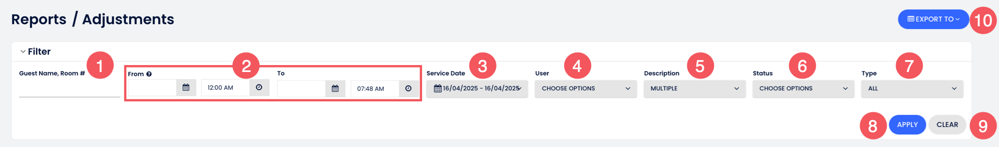 The report uses Service Date as a filterable date to associate adjustments with the correct stay or service period. The Transaction Date/Time remains immutable to ensure accurate accounting.