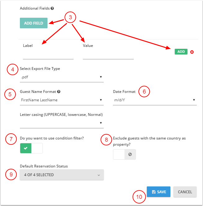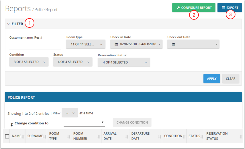 By default, only in-house guests will be displayed on the Police report, but you can filter by reservation status and also customize the exported version to display other statuses.