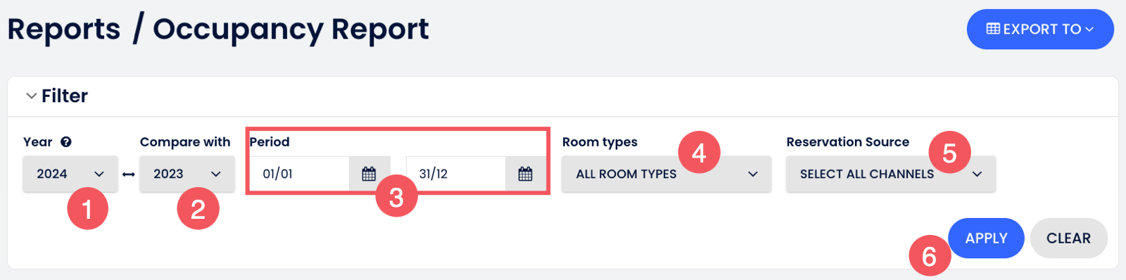 Once you're on the Room Sold/Occupancy Report page, you can apply different filters to generate the report: