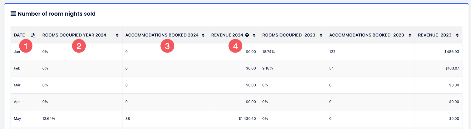 - Revenue for the primary selected year: Calculated as Total Room Rate plus Other Room Revenue plus Room Revenue Adjustments. This includes room rate, manual room revenue, no-show fees, and manual room revenue adjustments. Excludes inclusive or exclusive taxes and fees, and cancellation fees. It follows USALI standards.
