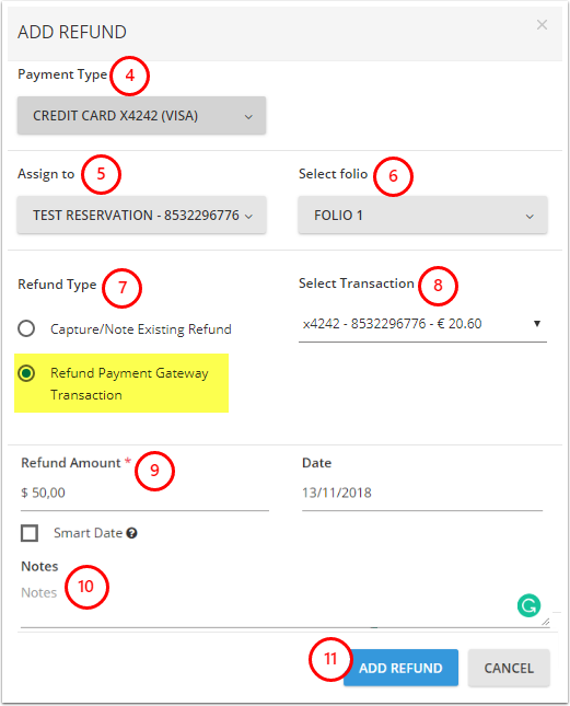 Selecting Capture/Note existing refund DOES NOT process refund to the guest's card through the payment gateway and the refund will be added only as a record to the guest's folio.