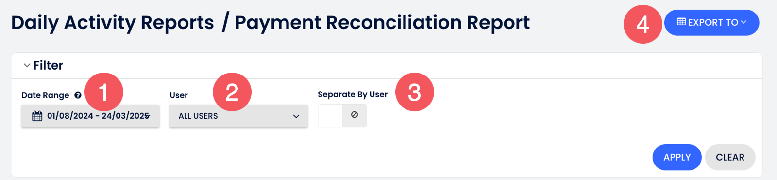 Automatic emailing is not available for this report. The Payment Reconciliation Report can be downloaded using the Export To option and shared as needed.