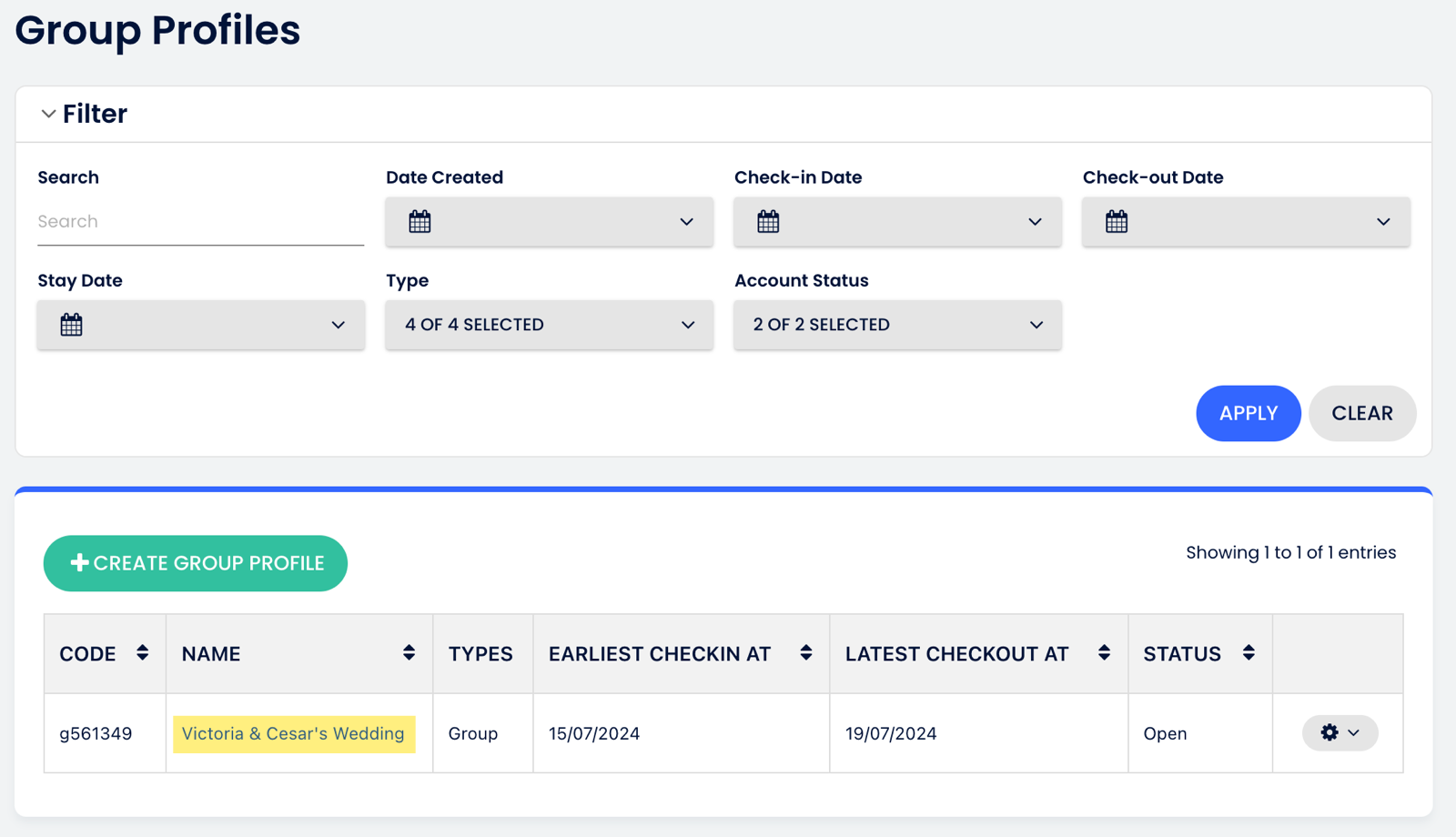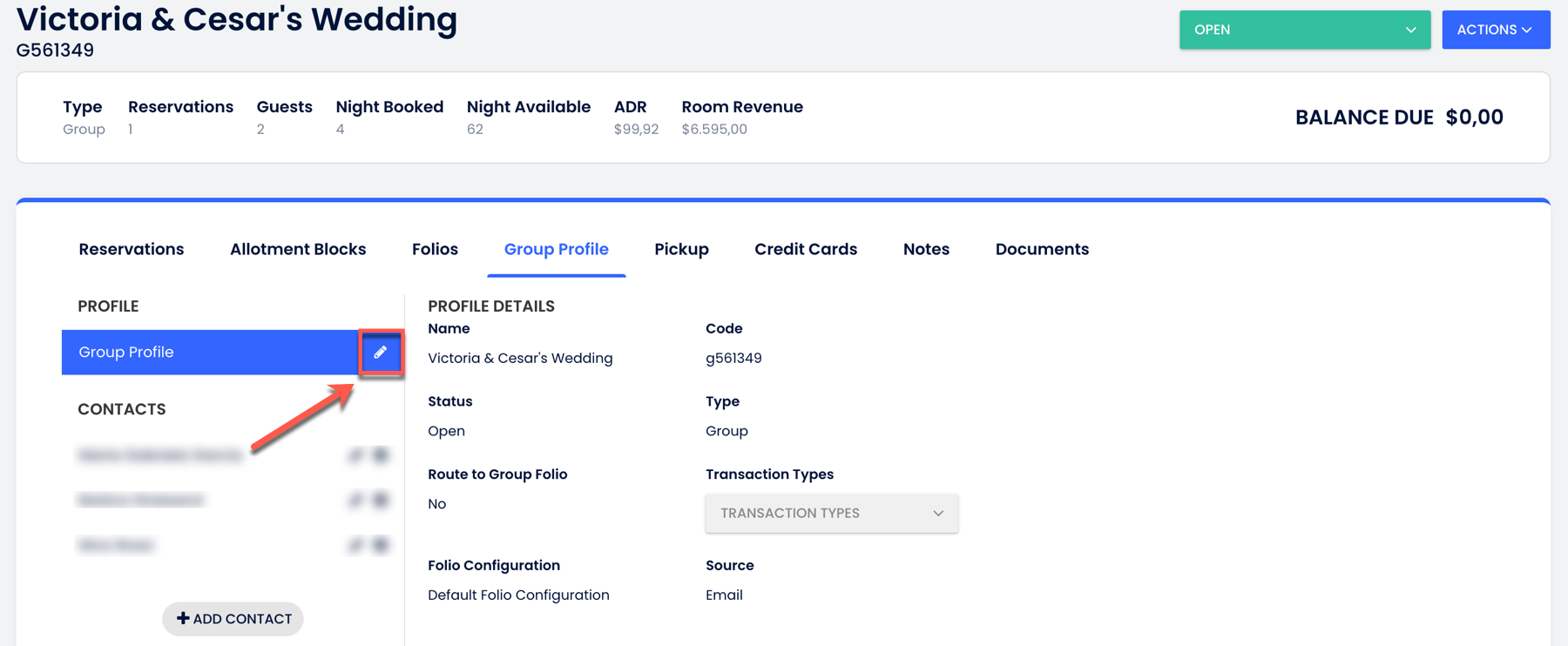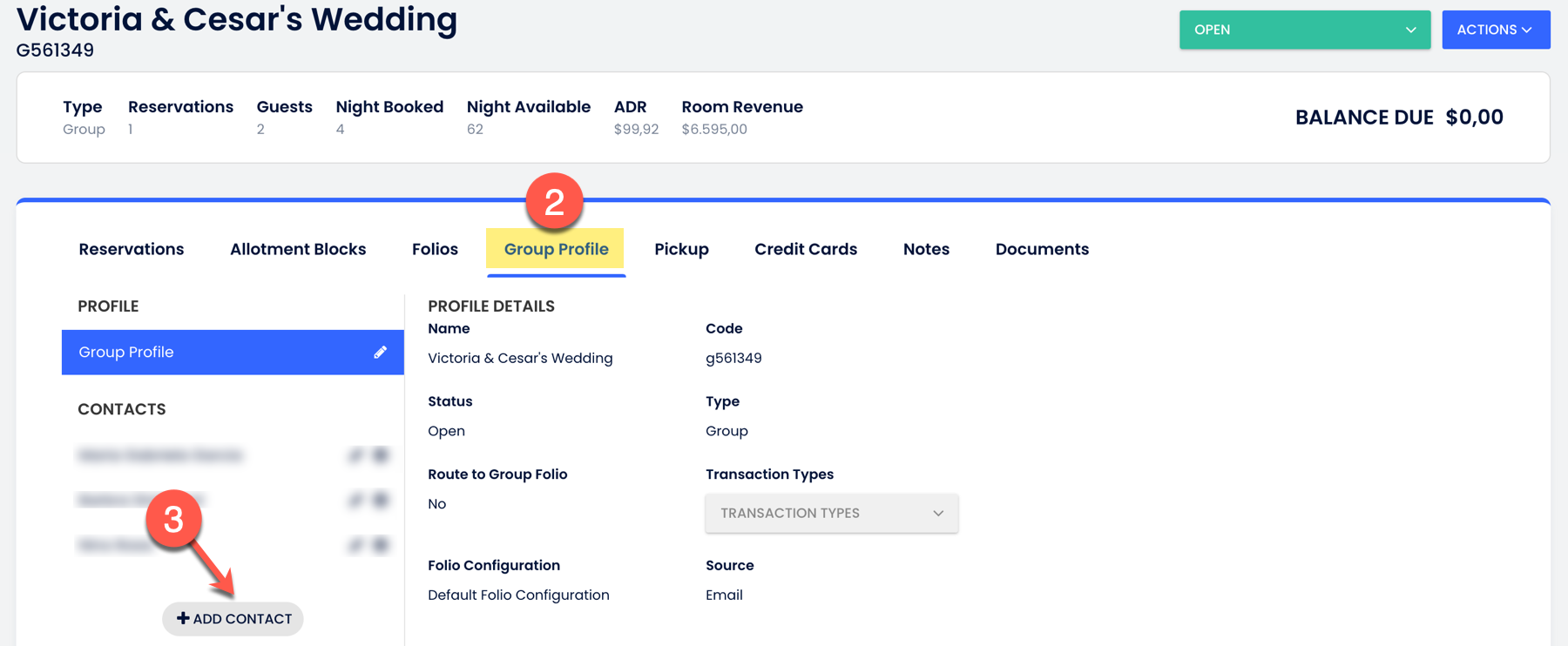 The Group Profile is a central hub for managing reservations tied to groups, such as companies, wedding parties, or travel agencies, in Cloudbeds' Group Management module. Each group profile may include multiple contacts with details such as their name, email, phone number, and additional information. These contacts are key for negotiations, handling availability, sending invoices, and discussing deposit and payment policies.