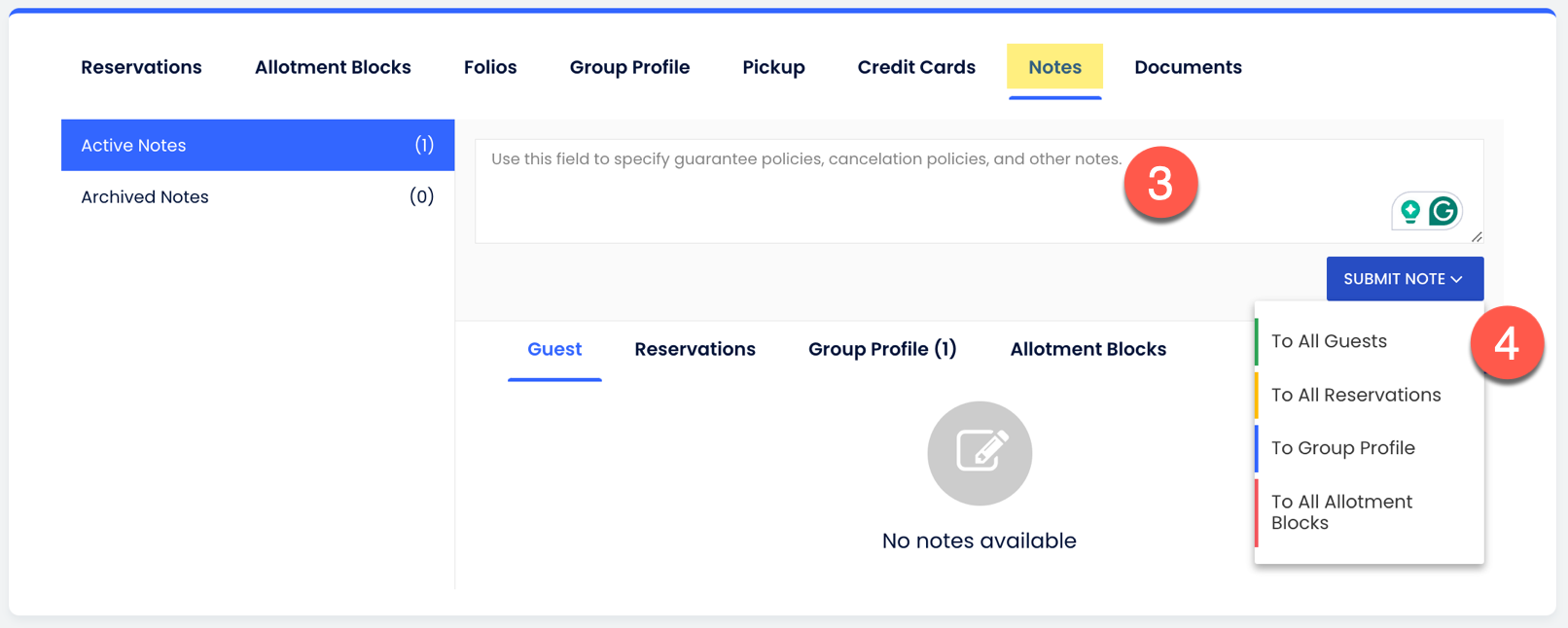 Follow these steps to add notes to a Group Profile, Allotment Block, Reservations, or Guests: