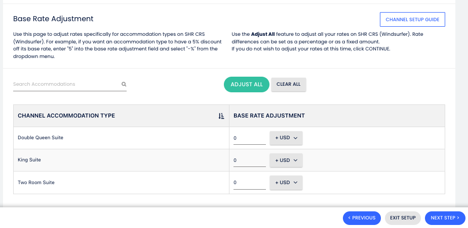 - Add a Base Rate Adjustment for each room type (if needed). When completed, click Continue, or leave it at zero if you want to skip it.