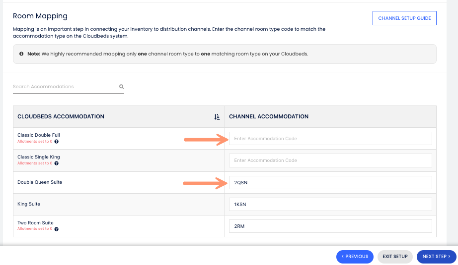 - The SHR Room Code must be entered in the Cloudbeds Channel Accommodation column.