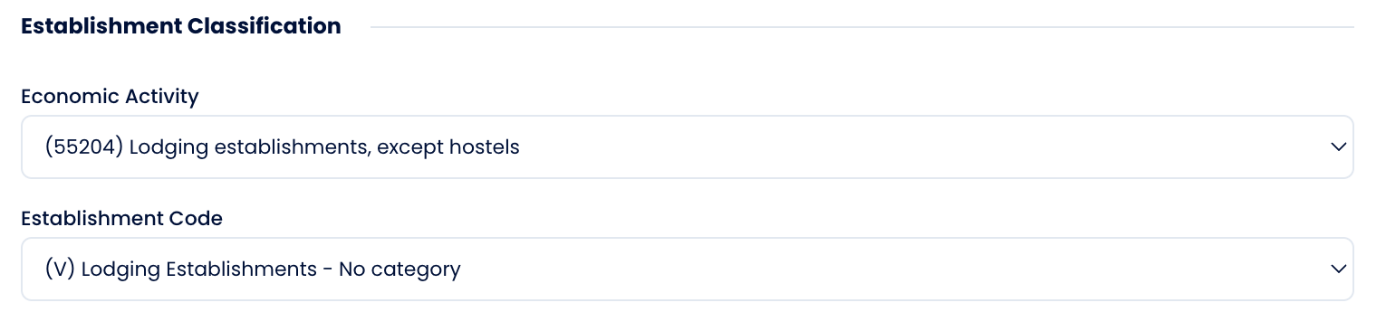 Establishment Code — Select the category that corresponds to your property's classification. The valid codes depend on the Economic Activity you selected above — refer to the table below to find the right code for your establishment type: