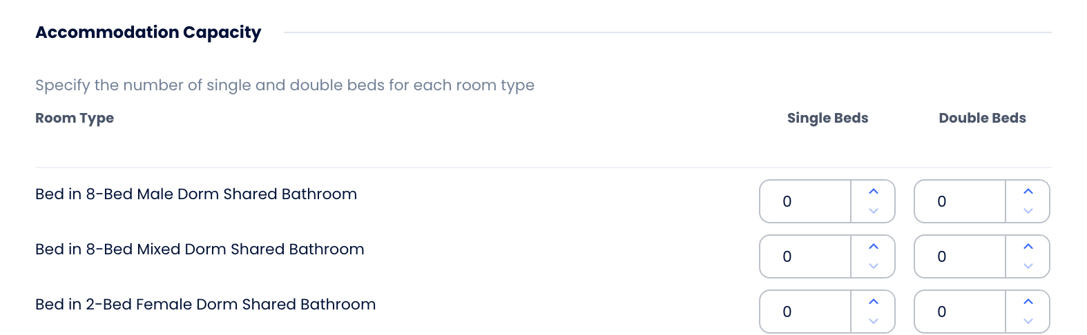 For each room type listed, enter the number of Single Beds and Double Beds it contains.