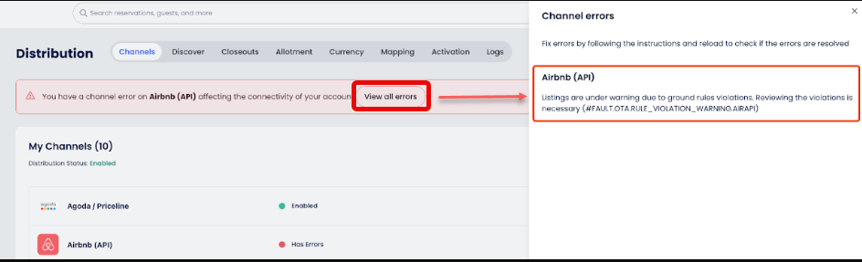 When a listing quality warning is received via Cloudbeds, it means that Airbnb has identified an issue that may require action for the property. These notifications are sent when an action is required from the host. If you receive any notification in your Cloudbeds Distribution page, follow the steps below to verify and fix the quality issue presented.