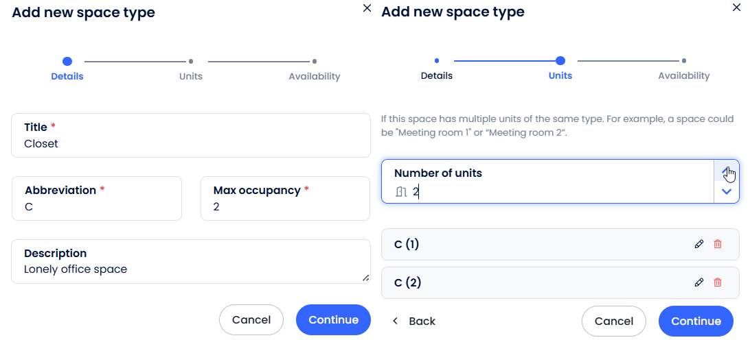 - Units: Define how many of these spaces exist (e.g., 5 "Pool Cabanas"). You may give each individual unit a specific title.
