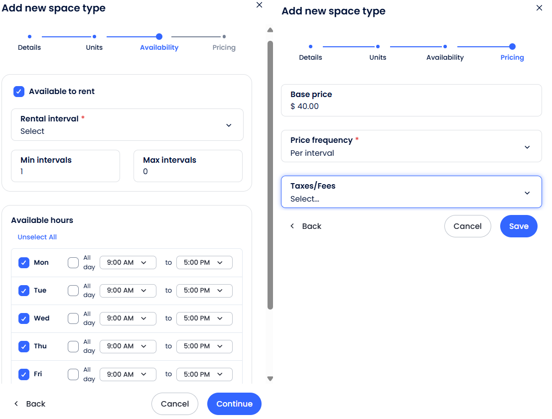 - Click on +New Space Type to define your spaces (e.g., Meeting Room A, Pool Cabana 1).