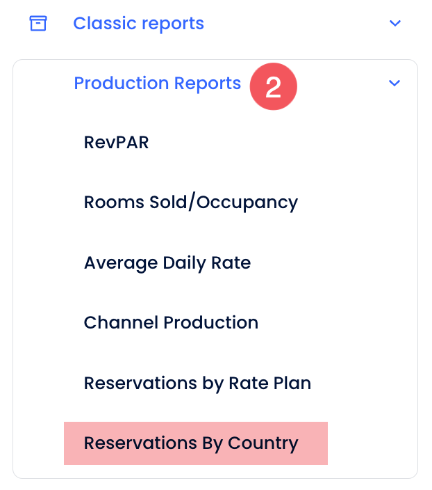 - Click Production Reports and select the Reservation by Country report