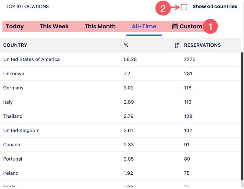 - By default, the report shows the top 10 countries for today, but you can filter the reservations by Today, This Week, This Month, All-Time, or Custom (select start and end period) — the period is when the reservation was created (reservation date).