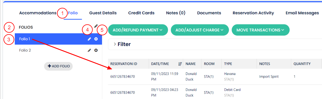 - On the left side of the screen you will see the folio(s) added to the reservation