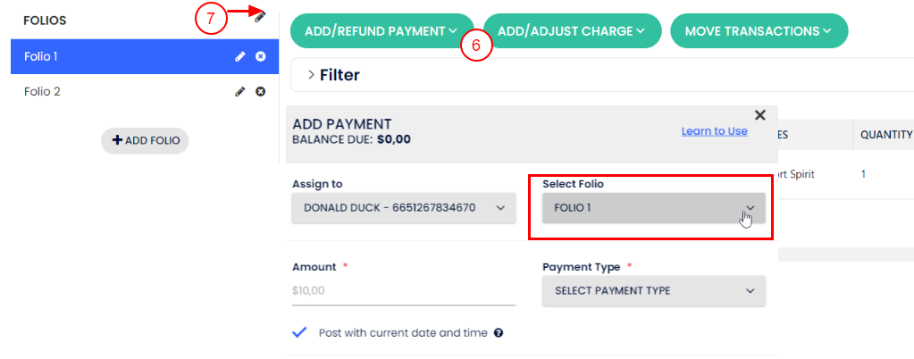 By default the folio which is currently opened will be selected, but you may select another folio to post the payment/refund/item to. - You may also change the folio configuration for the whole reservation. To do that click the pencil icon next to FOLIOS title.