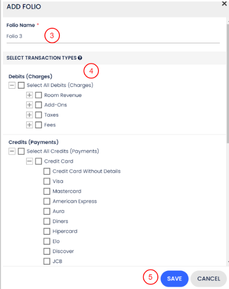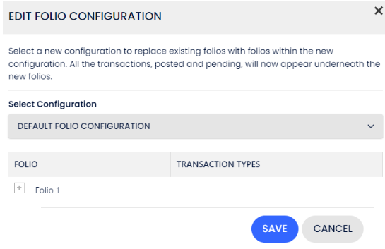 All transaction types will be moved to the folios specified within that configuration. If all transaction types are not selected underneath a particular folio, then all the transaction types that are not selected should always post to the first folio. - SAVE