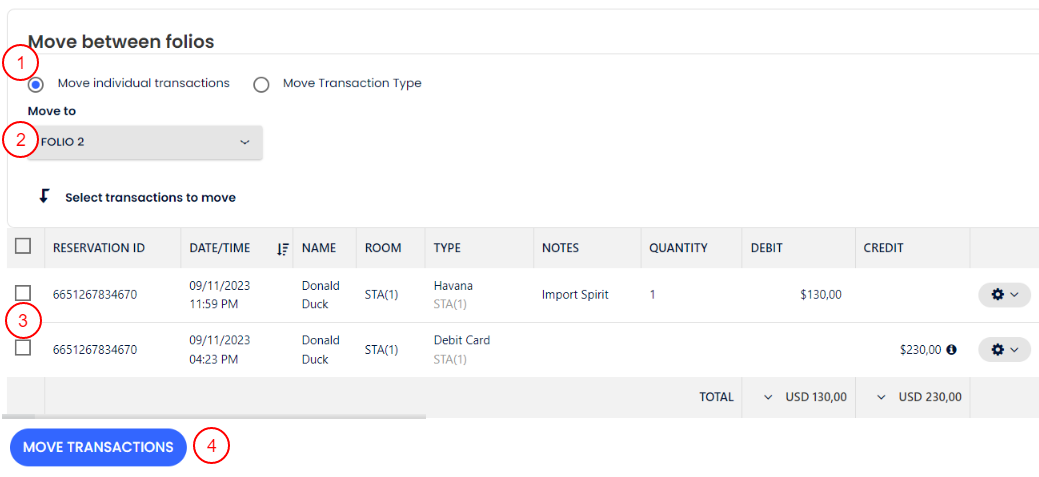 At the moment, the pending transactions (room rates, taxes, and fees) can only be moved once between folios. Posted transactions can be moved multiple times