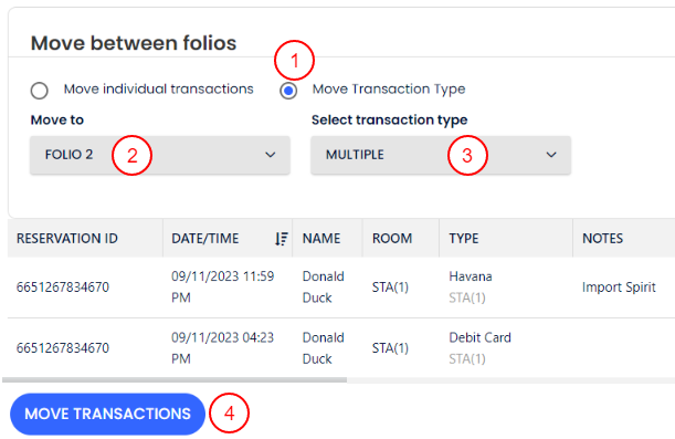 A button to Move Transactions has been added alongside the Add/Refund Payment and Add/Adjust Charge buttons. Clicking this button and selecting Move Between Folios will allow the user to move an individual transaction or transaction types across folios. A single transaction or a type of transactions can be moved.