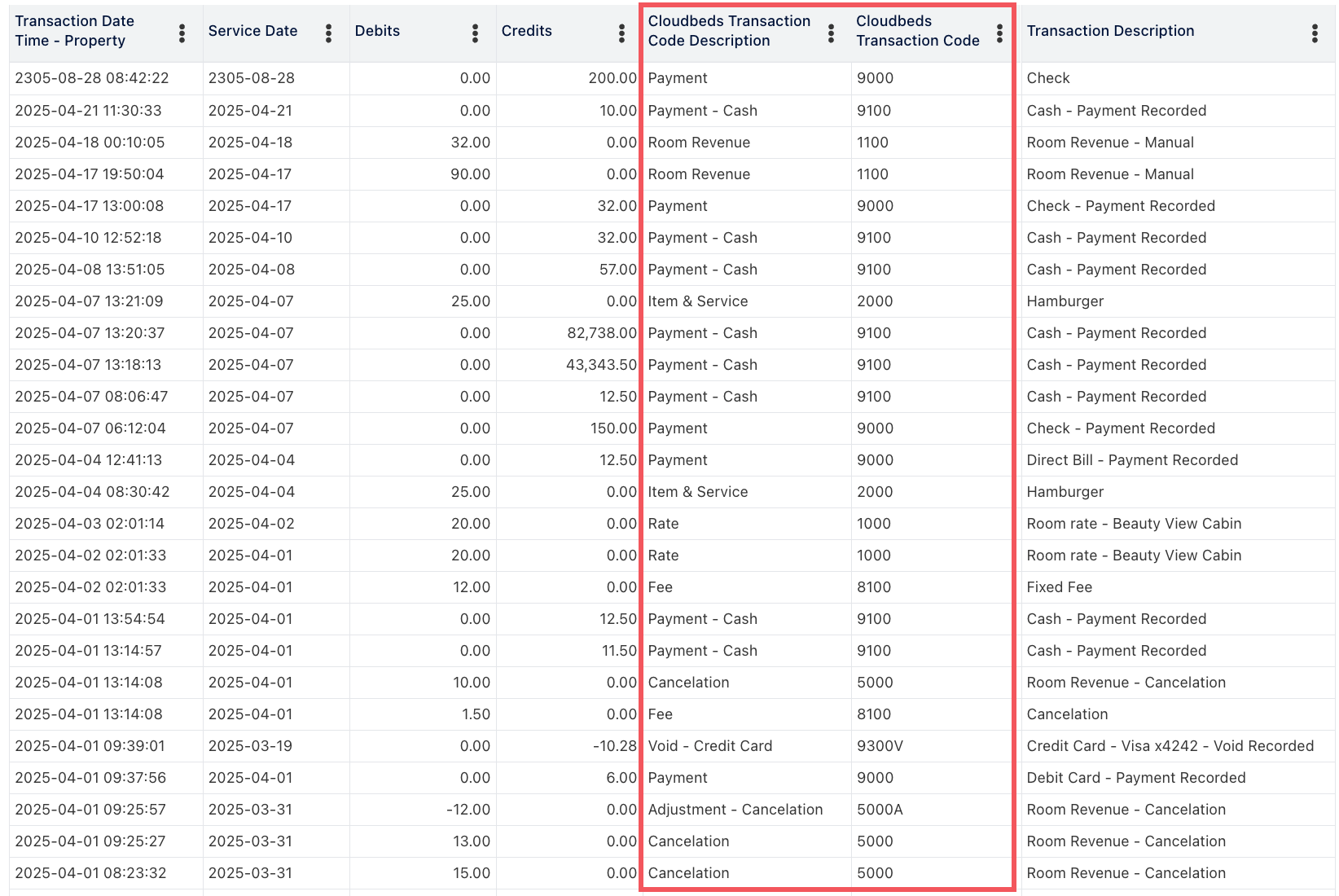 Transaction codes: These are now reportable within Cloudbeds Insights, allowing for detailed