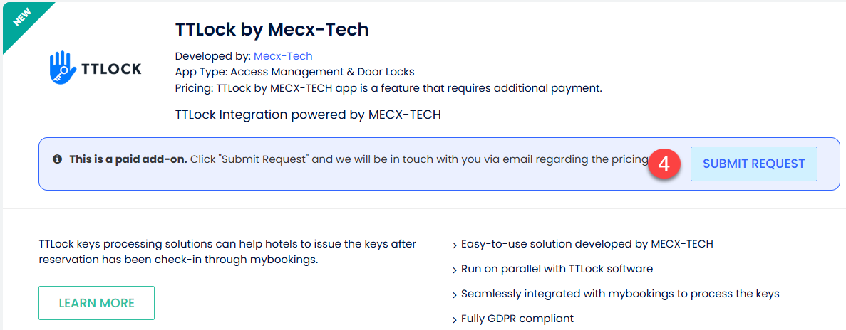 Experience the convenience and security of keyless entry with our TTLock integration, seamlessly managed through Cloudbeds PMS and powered by Mecx-Tech. TTLock is a global leader in smart lock solutions, providing innovative access control for a variety of properties. Their robust smart lock management system allows for remote control and monitoring of your door locks via a mobile app or web platform.