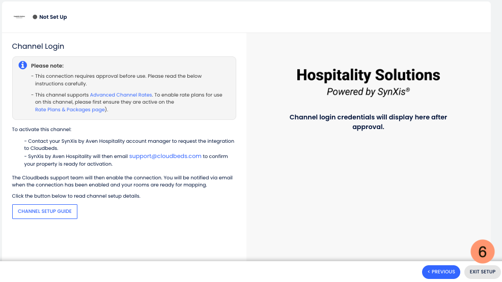 Once setup is completed, SynXis by Aven Hospitality will email our Support Team to confirm your property is ready for activation. Once confirmed, the channel status will change to Ready for mapping in Cloudbeds, and you can proceed with the next step.