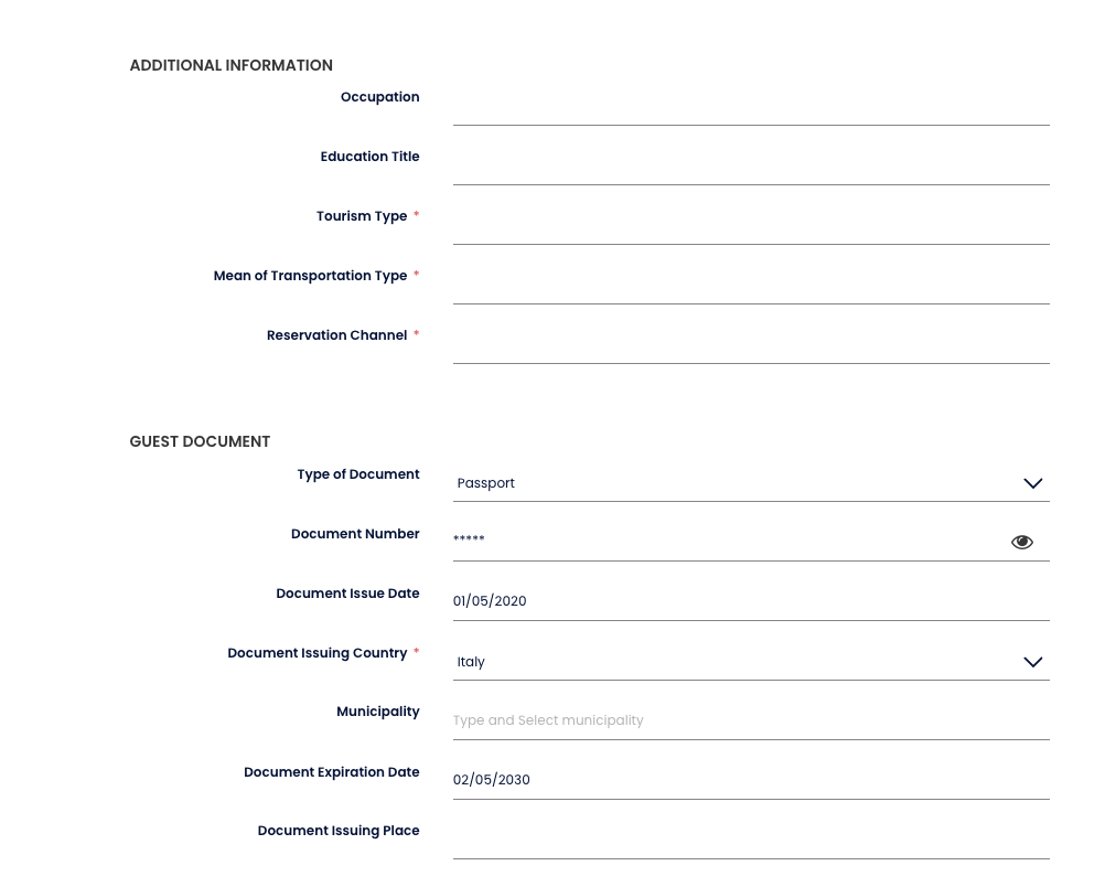 These fields are dynamic, meaning different fields will appear or be required based on guest characteristics, such as nationality (e.g., Italy resident vs. foreign guest).