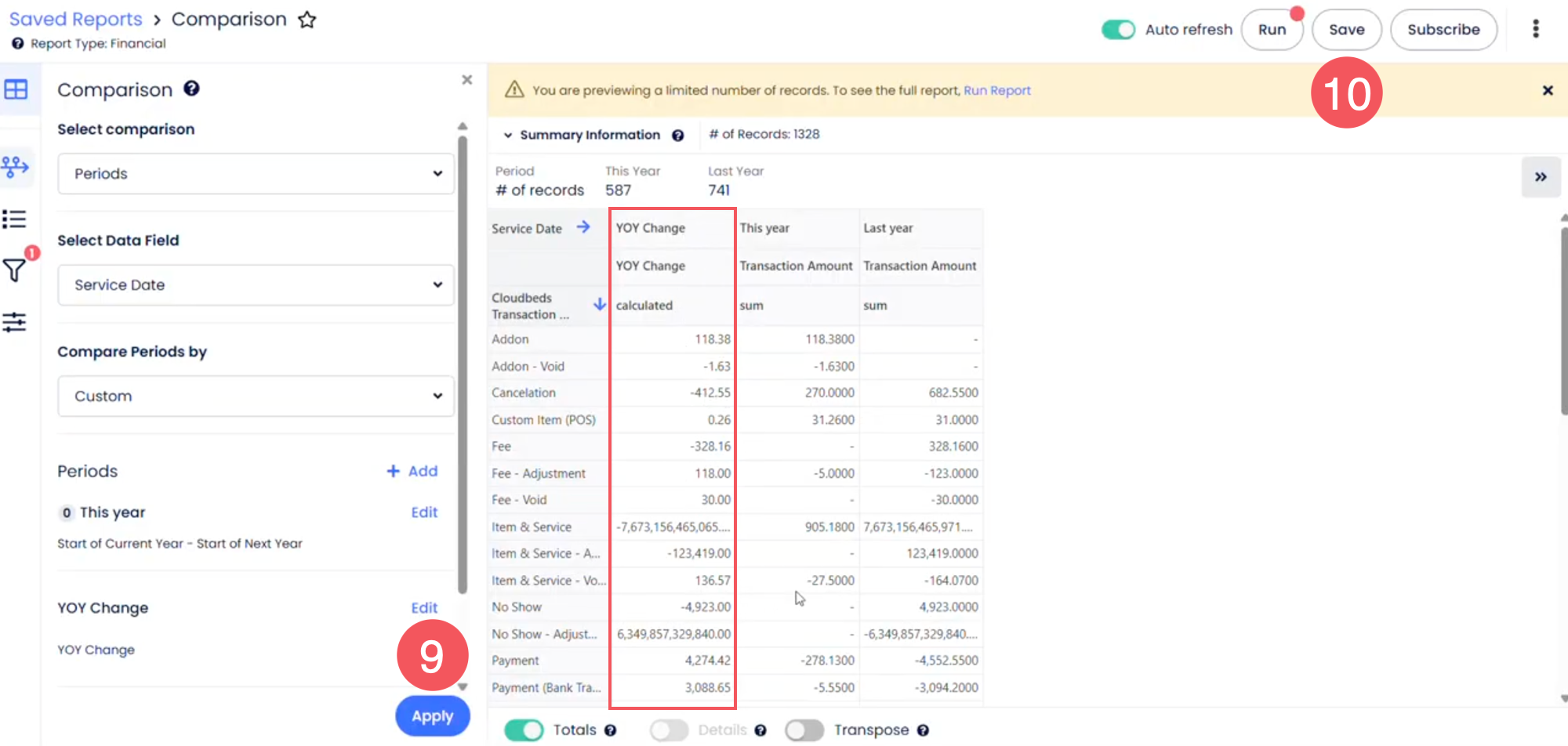 - Click Apply to preview the new "YOY Change" column, which shows the calculated difference between this year's and last year's transaction amounts.