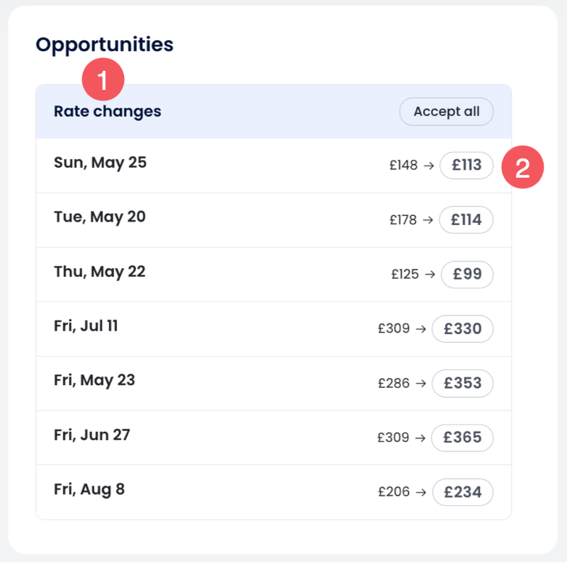 | ⓘ Clicking on a specific day reveals rate change recommendations and estimates the financial benefits of following them. Learn how to use this feature here. |