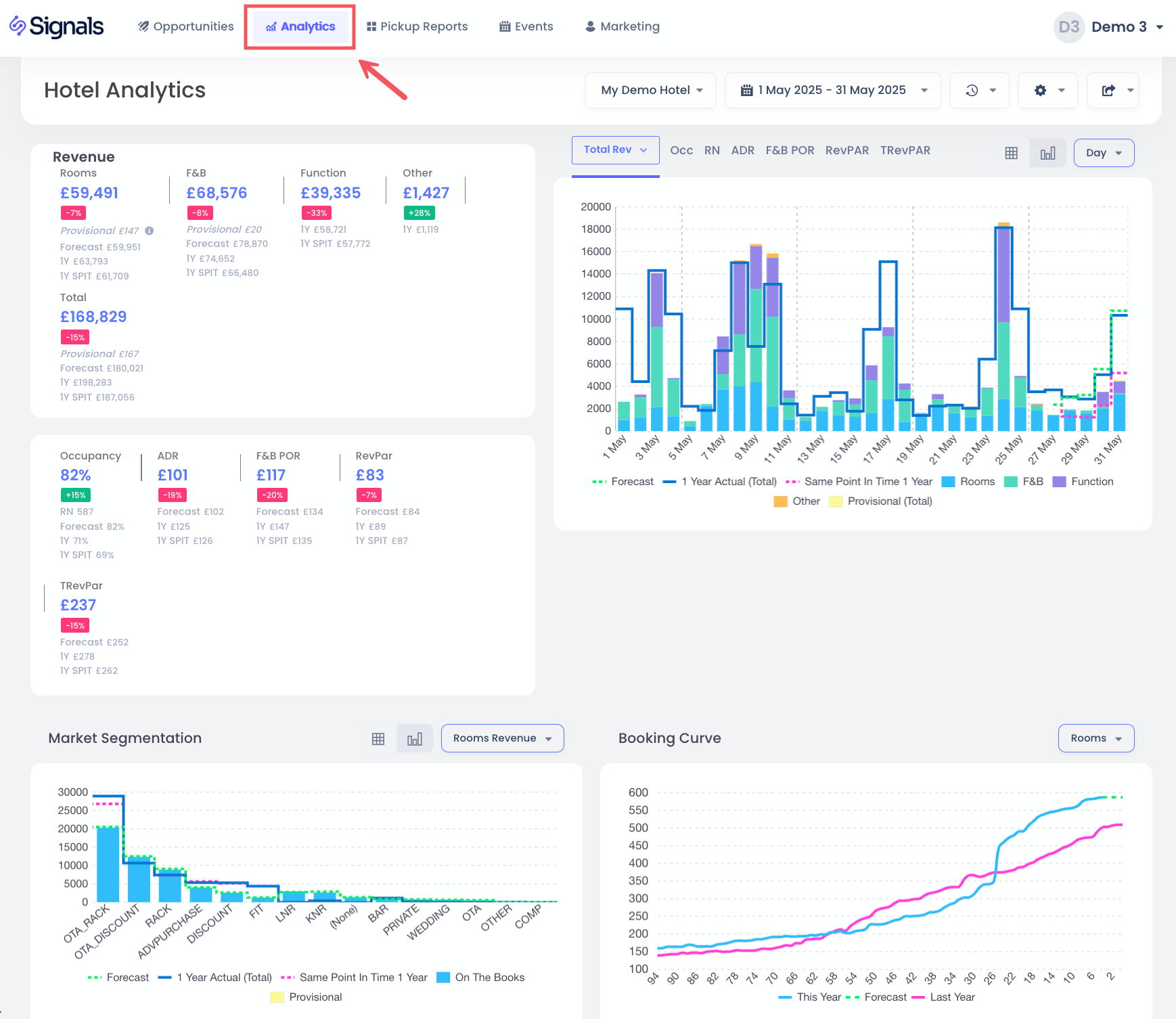 The hotel analytics view gives you an instant visual overview of the historical and future performance of your hotel.