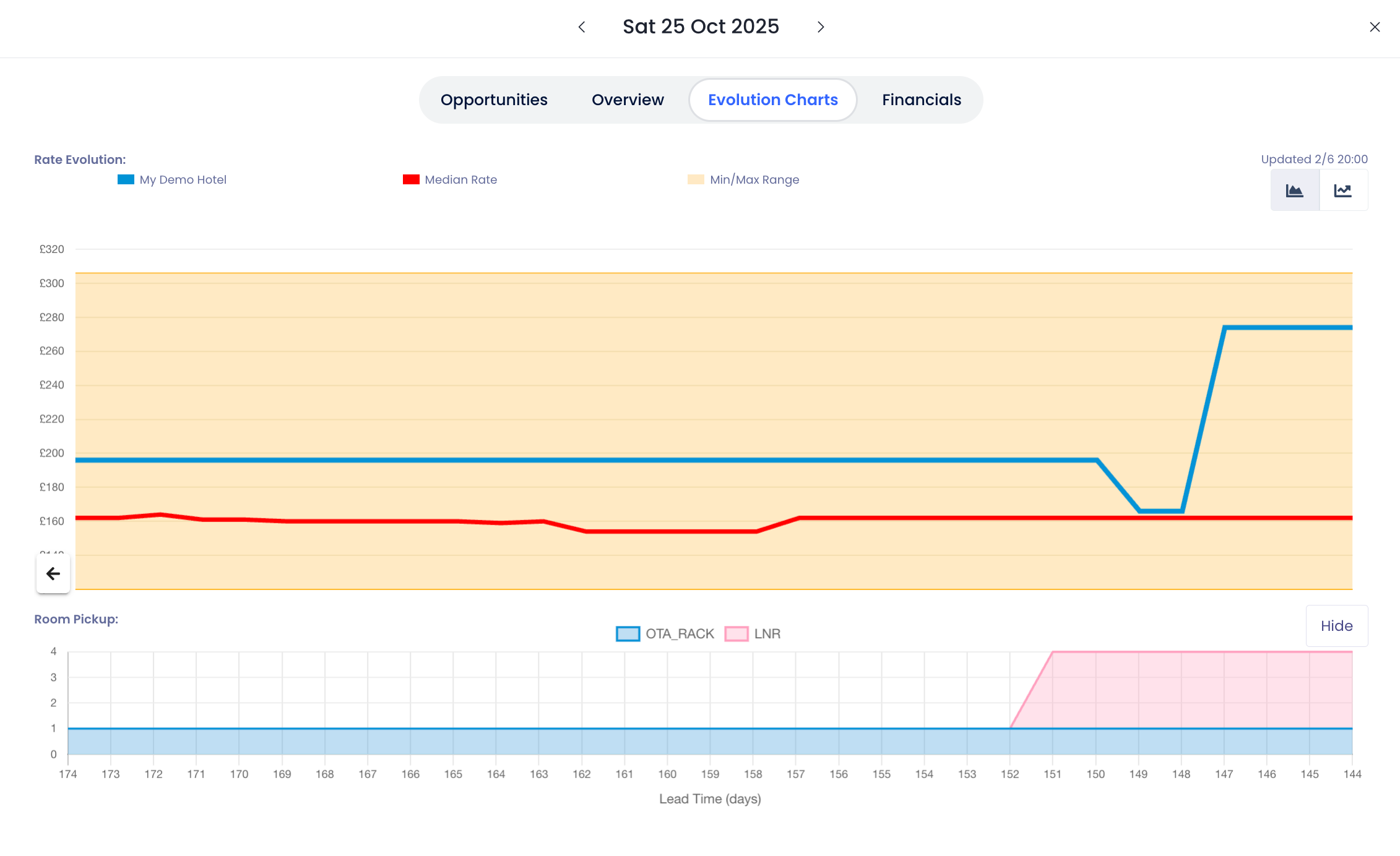 The Evolution Charts tab gives you visual trend data that helps you evaluate how your pricing and pickup behavior has evolved over time. This insight helps confirm whether a rate recommendation is timely or needs adjustment.