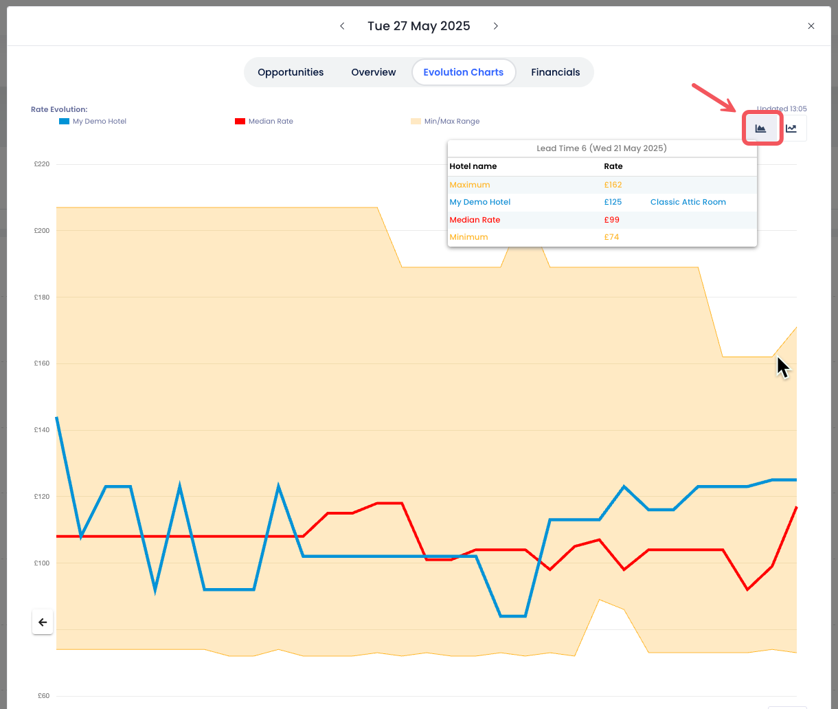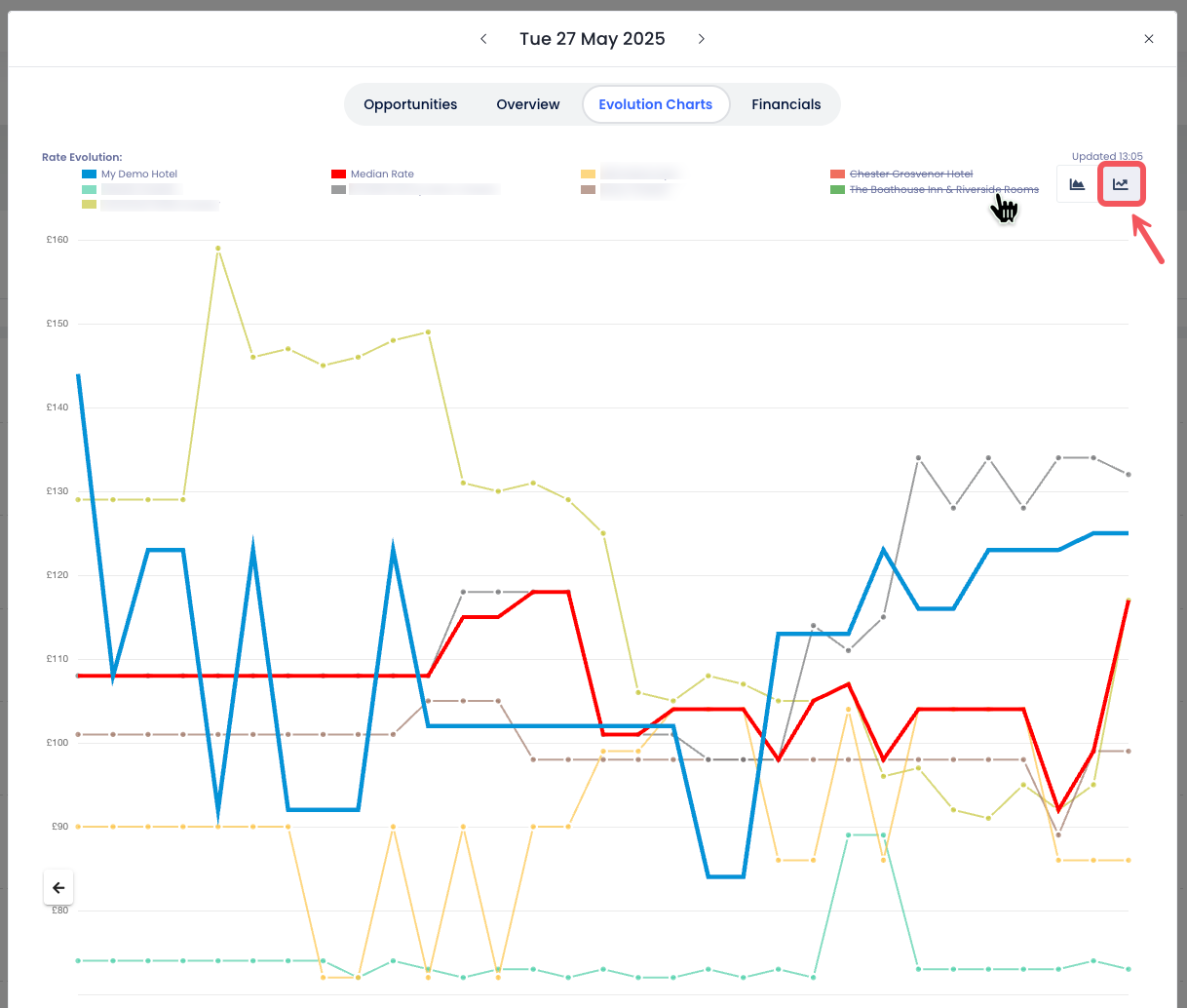 - Blue Line = your property’s rate (e.g., My Demo Hotel)
