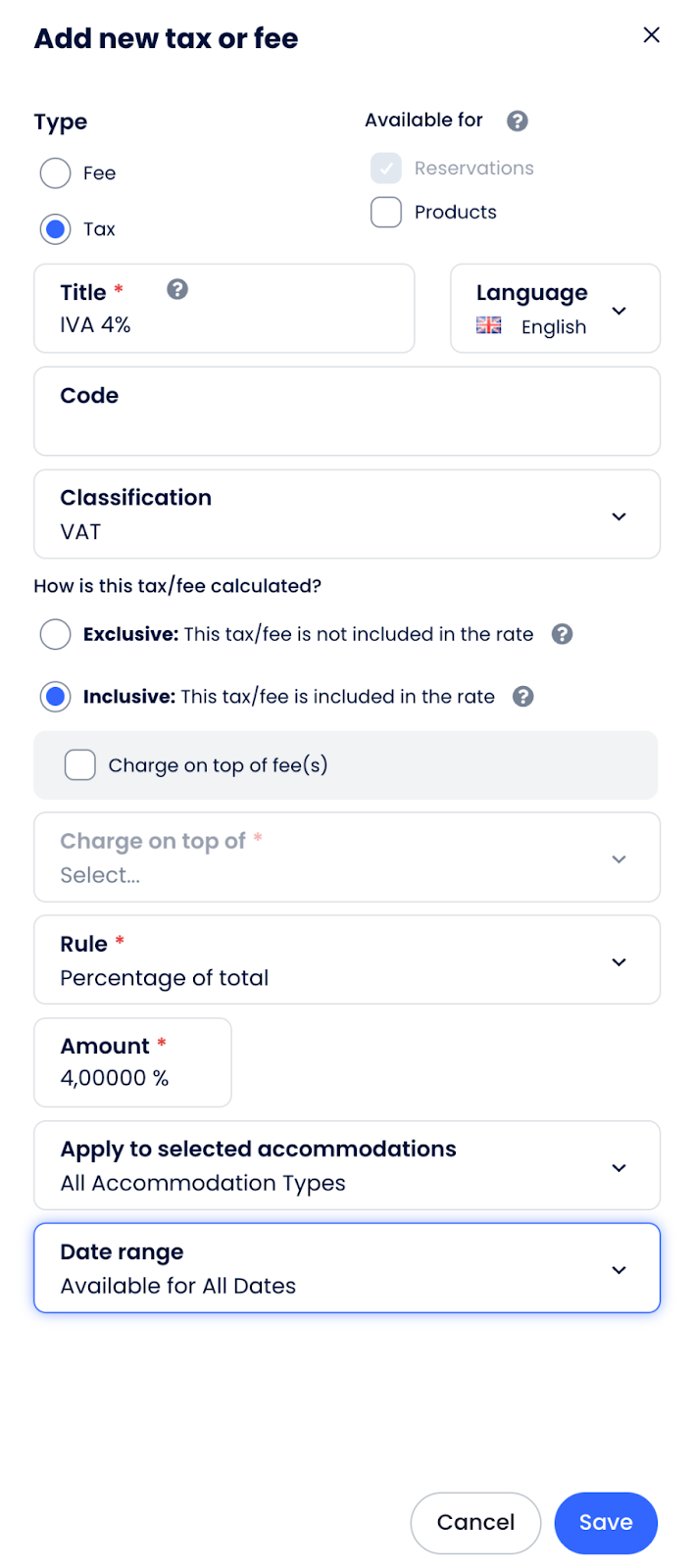 Tax IVA 4% Inclusive VAT (IVA) Items; Reservations Percentage of total amount 4% No