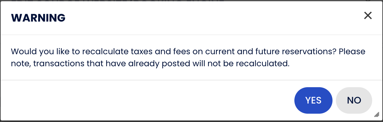 NOTE: When you click Save, you must say Yes to recalculate Taxes and fees on current and future reservations.