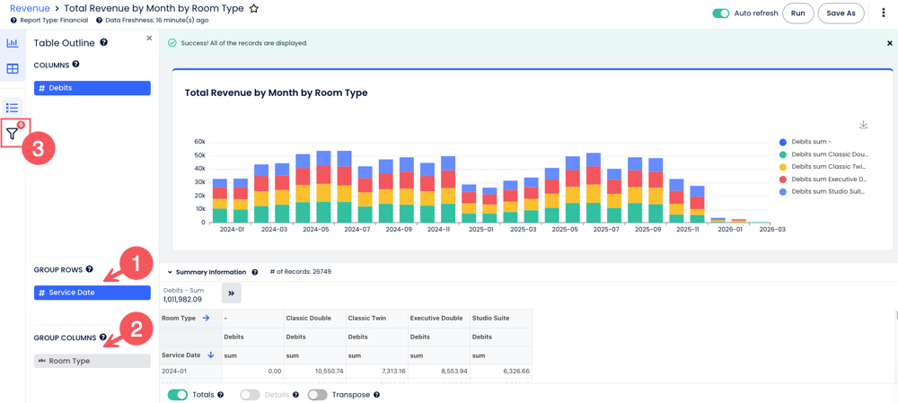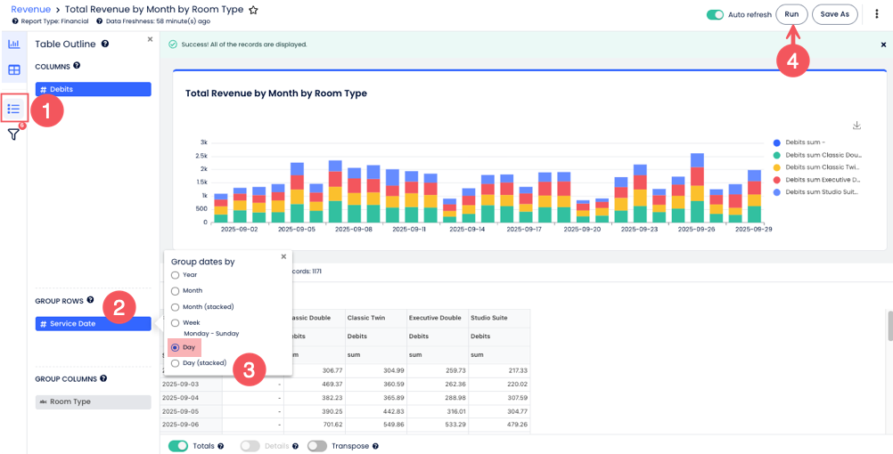 Grouping is controlled in Table Outline → Group Rows. More on this in the “See day-by-day revenue for the selected month” section below.