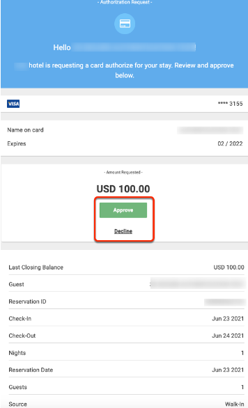 The guest can either Approve or Decline the authorization request by clicking the links in the email. In case your guest cannot complete the authentication process, they need to contact their bank to get more details on why it happened.